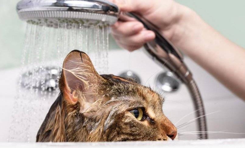 Намочить и смыть пену с кота можно при помощи ковшика или кувшина. Душ использовать крайне нежелательно, так как он шумит и пугает животное еще больше. Другой выход – включить напор на минимум.
