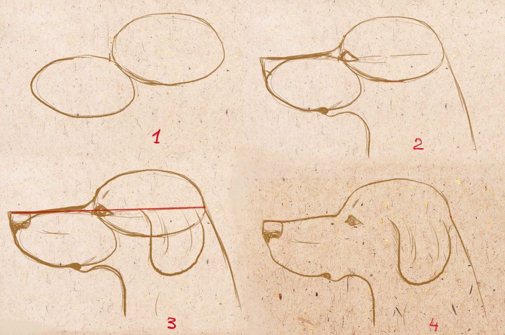 - От верхней части головы — большого круга, рисуют уши. К примеру, для лабрадора – треугольные.