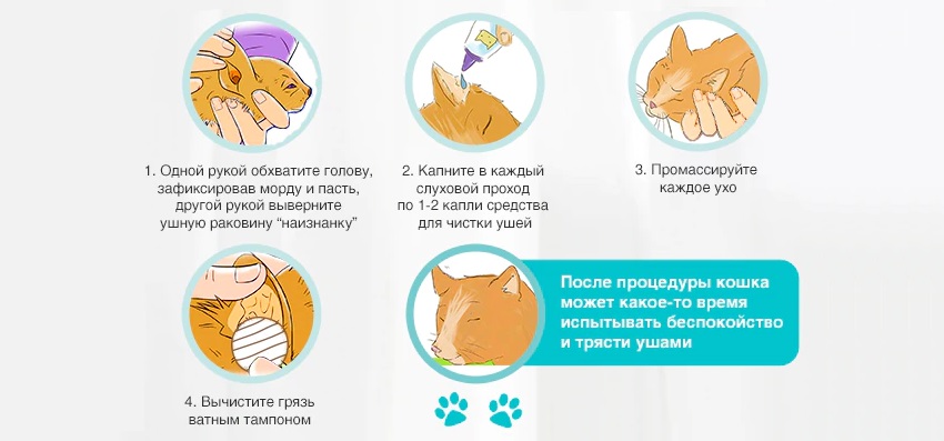 Уши очищают примерно раз в 2 недели или по мере загрязнения. Для процедуры используют кипячёную воду, отвар ромашки или физраствор. Чистят уши ватной палочкой. Жидкость убирают сухим ватным тампоном. Работают только с видимой частью ушной раковины.