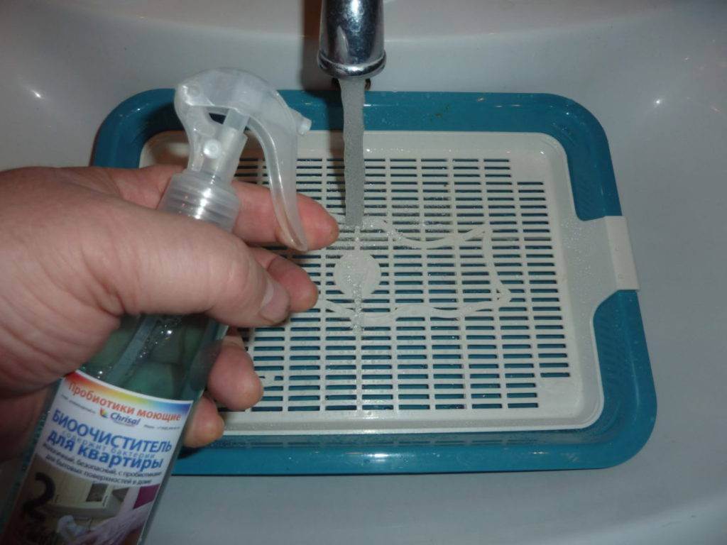 Уход за этим приспособлением прост, но требует больше времени и усилий, чем очищение лотка с наполнителем. Мыть туалет питомца с решеткой надо после каждого использования, при этом не имеет значения, сходил в него кот по-маленькому или по-большому. Ежедневное очищение предполагает ополаскивание конструкции теплой водой, генеральная чистка – замачивание и использование моющего средства и специального состава для устранения запаха кошачьей мочи.