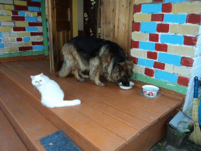 Владельцы обязаны помнить: собака склонна к перееданию, потому определенная часть кошачьего корма будет съедена. Кошка может ходить полуголодной. Из-за этого питомцы могут между собой враждовать. Если есть возможность, нужно ставить миски животных так, чтобы один не смог заглядывать и лакомиться из миски другого.