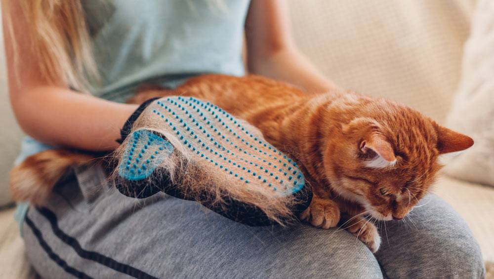 Если вычесываете животное в первый раз, начните с резиновой рукавицы или массажной щетки