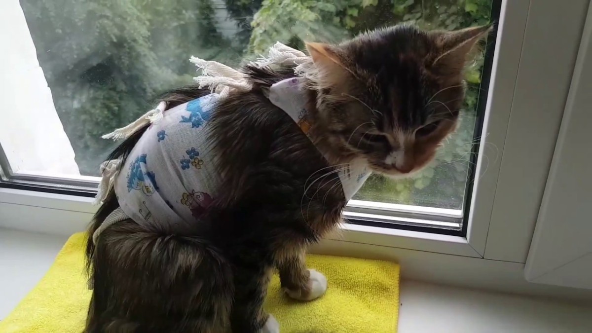 Надевать попонку или воротник неопытному владельцу кошки не так легко, потому предварительно изучите инструкцию – тренироваться на животном, пережившем операцию, не стоит. Отрегулируйте завязки попоны, чтобы они не давили в области подмышек и паха. Снимать «наряд» самостоятельно без разрешения врача нельзя! Это чревато воспалением, самым серьёзным последствием которого станет необходимость снова провести хирургическое вмешательство. Обычно через пару дней животное смиряется с неудобством.