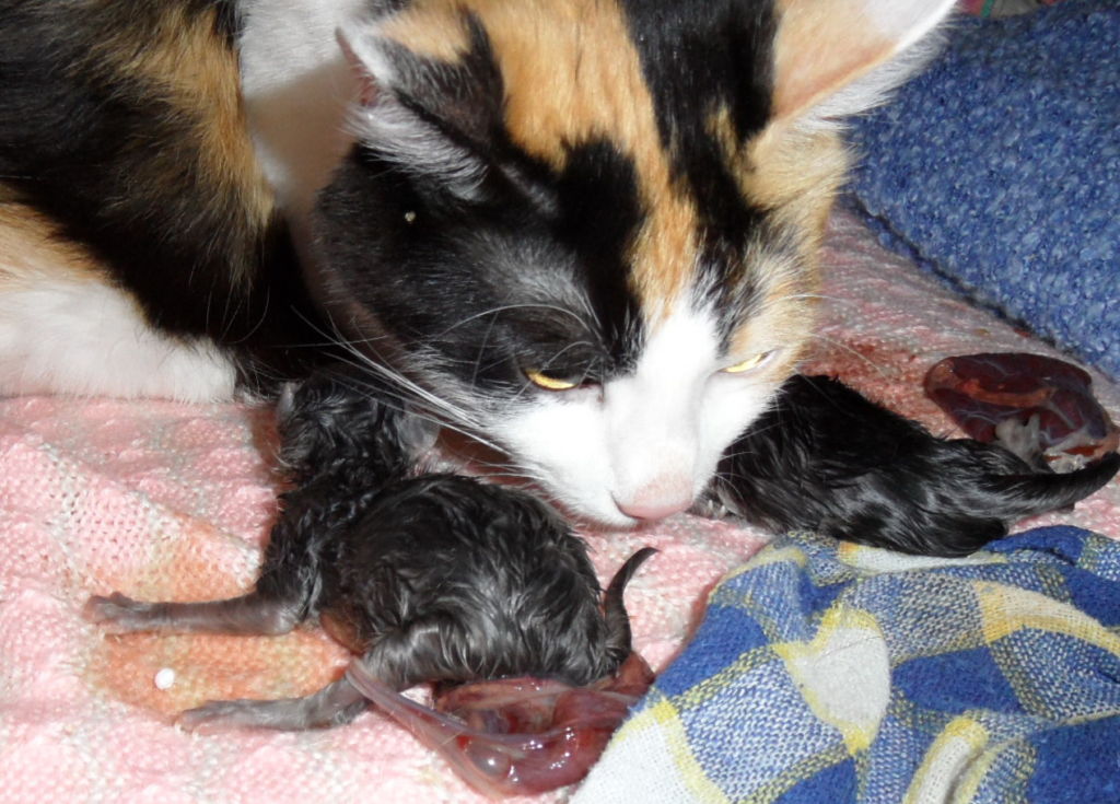 Очищение плода. Мать разгрызает околоплодный пузырь, освобождает котенка и активно его вылизывает, убирая слизь изо рта и носа. Когда детеныш начинает пищать, запускается процесс дыхания.