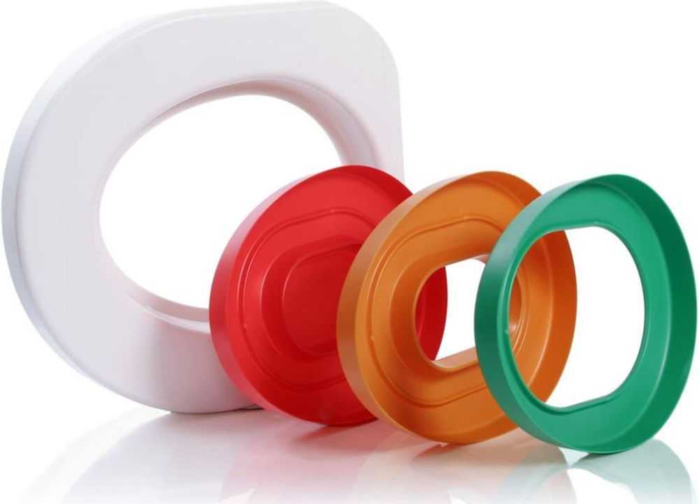 Главным элементом тренажёров является насадка-лоток, на дне которой – отверстие с удаляемыми кольцами. Эти кольца позволяют постепенно расширять дыру в конструкции. Его функция такая же, как в описанном выше первом методе.