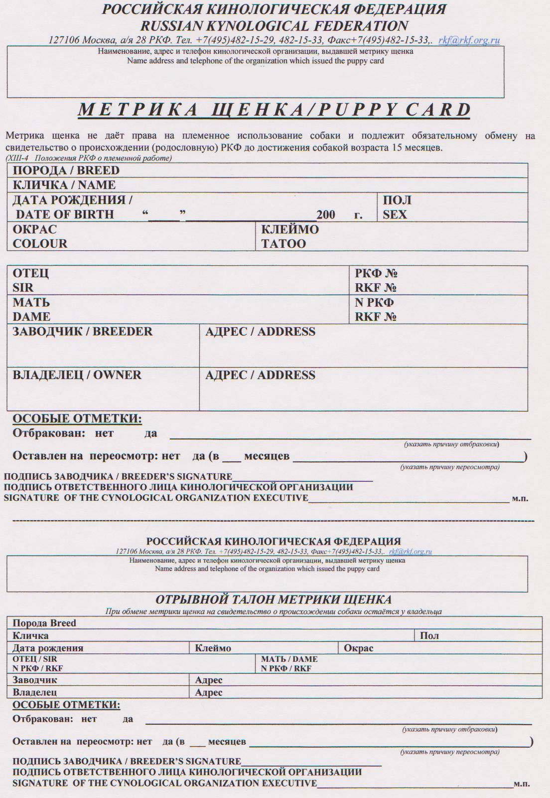 Метрика не дает владельцу права на участие в племенном разведении и требует в будущем обязательного обмена на родословную. Если она была утрачена, ее можно восстановить по номеру клейма собаки.