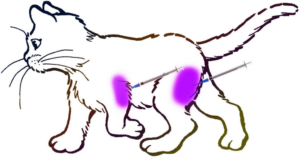 - При внутримышечном введении чередуйте места для уколов, делайте их в разные лапы и разные места на лапе.