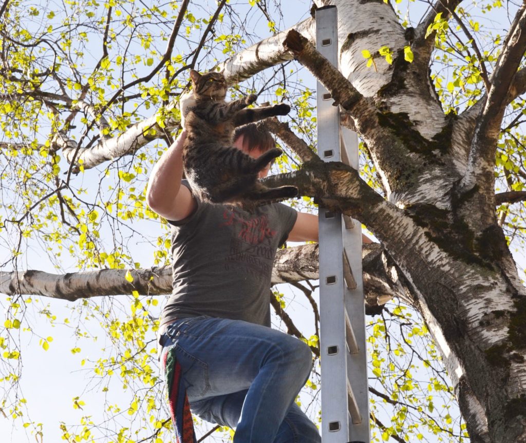 Попробовать снять верхолаза с дерева можно при помощи приставной лестницы. Раздвижную лестницу необходимо приставить к стволу дерева так, чтобы спуск был пологим. Не стоит ожидать, что питомец быстро поймет, что за помощь к нему пришла, а дать некоторое время для оценки ситуации.