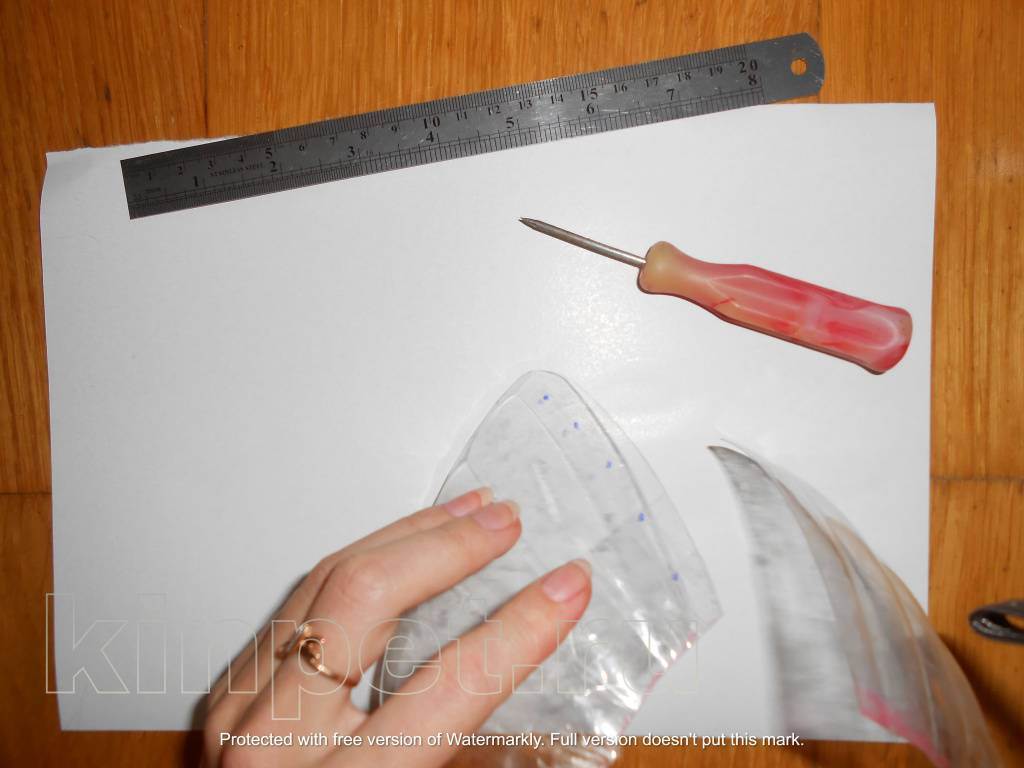 - Чтобы соединить вместе края, понадобится липучка или четыре ленты, которые пришивают на каждую сторону конуса. Отверстия в пластике можно сделать гвоздём или толстой иглой. Удобно для этой цели использовать степлер.