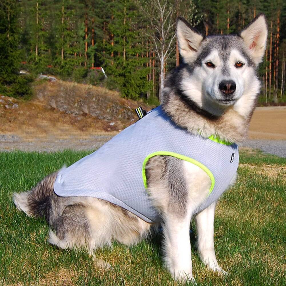 Для собак с темной шерстью, которая сильно нагревается на солнце, можно приобрести специальный охлаждающий жилет, комбинезон или косынку. Если нужно срочно куда-то идти по жаре, а одежды под рукой нет, можно надеть на нее обычную белую х/б футболку.
