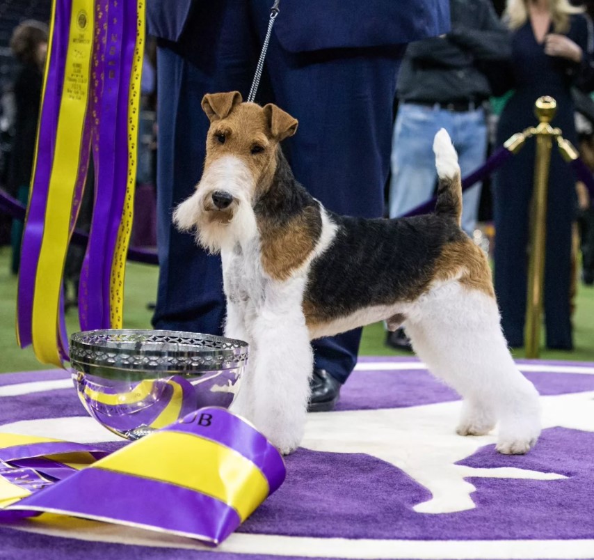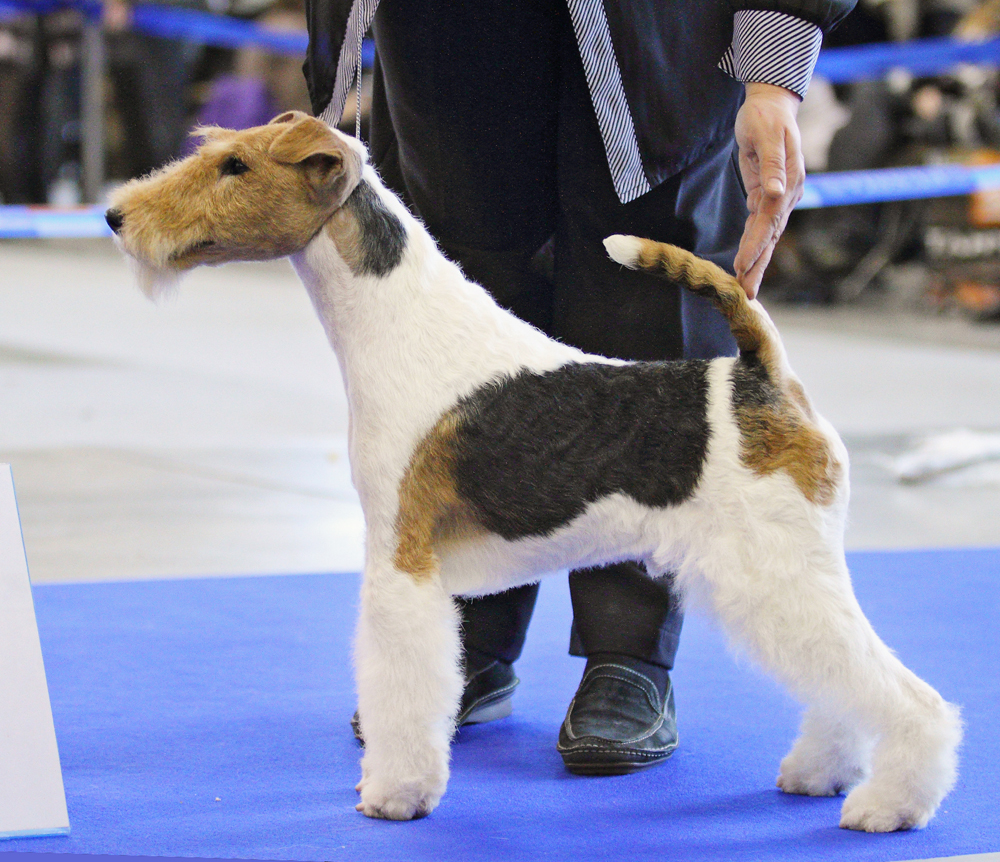 Жесткошерстный фокстерьер на выставке собак