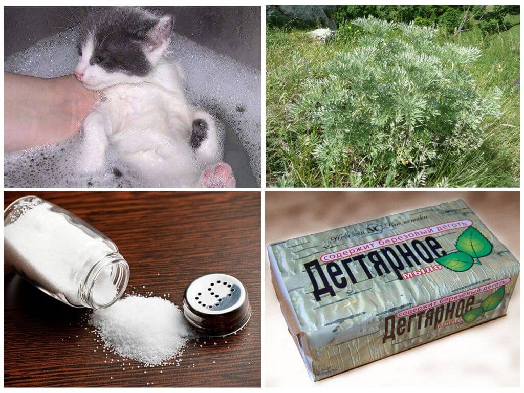 - в возрасте 1 месяца котят можно мыть с дегтярным мылом, которое намыливают и оставляют на 15 минут, затем смывают вместе с придушенными блохами, по мере высыхания шерсть аккуратно вычесывают, удаляя всех паразитов;
