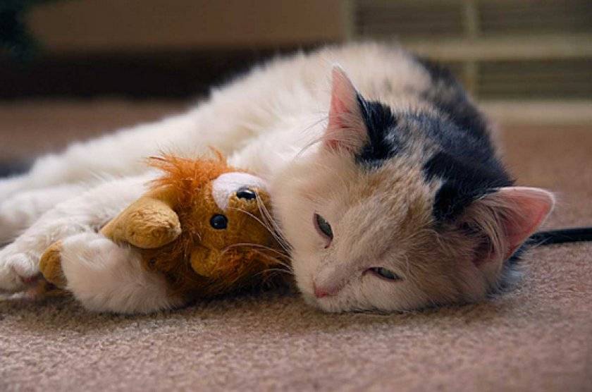 - Изменение поведения кошки. Пушистый любимец отказывается от еды, много спит, практически не играет, предпочитает прятаться в незаметных местах. Некоторые животные могут становиться агрессивными: в ответ на попытку приласкать или погладить они нападают на человека, что является проявлением защитного инстинкта.