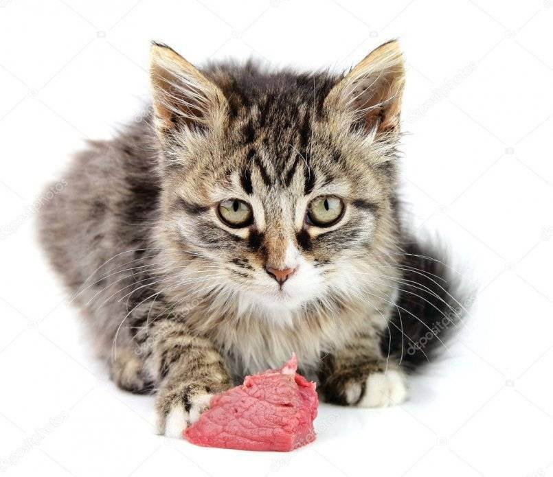 Котятам мясную пищу можно вводить в рацион по достижении 1,5—2 мес. Лучше свежий продукт наскоблить от основного куска и заморозить. Кормить следует маленькими порциями, начиная с 2—3 г, внимательно наблюдая за реакцией организма. Новая еда может спровоцировать диарею. Начинать прикорм нужно с говядины, поскольку этот вид мясной пищи более жесткий, что способствует навыкам жевания, укреплению жевательных мышц и массированию десен. Можно давать мягкие косточки и хрящи кролика, шейки и крылышки курицы, предварительно порезанные на мелкие кусочки, филейную часть птицы, домашний сыр.