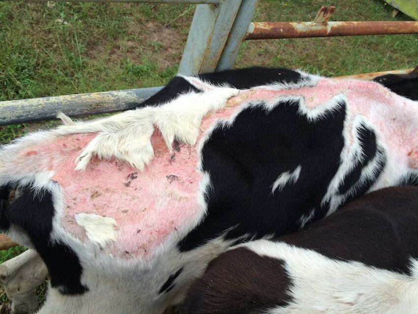 Характерными признаками являются пузырьки на коже животных, которые постепенно лопаются, покрывают кожу коровы своим содержимым. Оно высыхает, образует корочку, которая отпадает, оставляя после себя мокнущую поверхность.