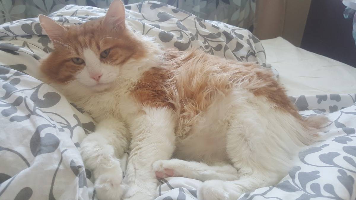 - может наблюдаться недержание мочи (животное оставляет мокрые следы там, где лежала/спала, у длинношерстных кошек на шерсти в промежности могут быть капельки мочи с кровью);
