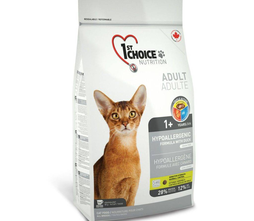 Канадский производитель корма 1st choice сконцентрировался именно на сухих кормах, которые выпускаются в стандартных расфасовках по 907 гр, 350 гр, 2,72 кг, 10 кг.