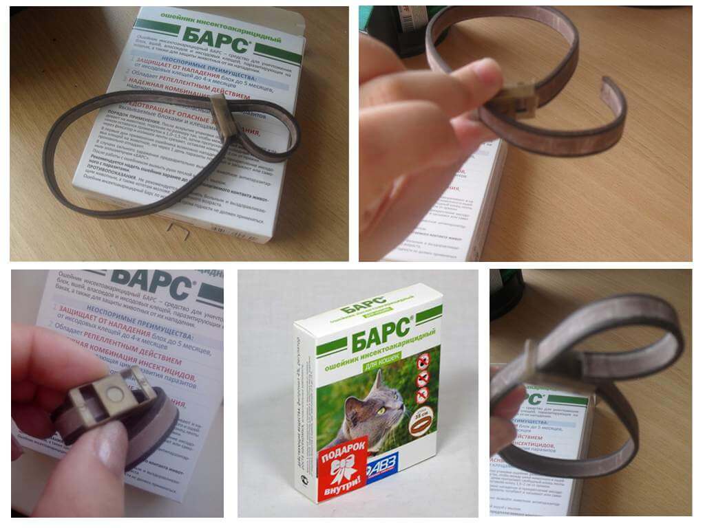 | «Барс» ошейник инсектоакарицидный | Фипронил, дифлубензурон | Принцип действия ошейника такой же, как и у средства в каплях. Однако ошейник обеспечивает более длительную защиту, так как постоянно находится на кошке. Активные вещества постепенно переходят на кожу в процессе всего срока ношения, поэтому ошейник защищает от иксодовых клещей до 4 месяцев, другие паразиты не беспокоят кота до 5 месяцев. | 8 недель |