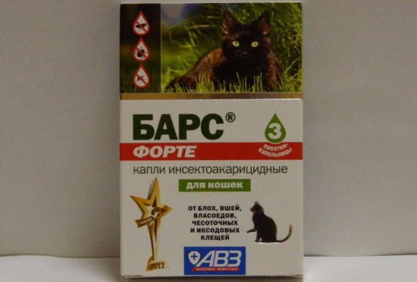 Инсектоакарицидный препарат отечественного производства. Средство приобрело достаточно широкое распространение из-за своей низкой стоимости, а также достаточной эффективности в борьбе с блохами и клещами. Активным компонентом капель «Барс» является инсектицид перметрин.