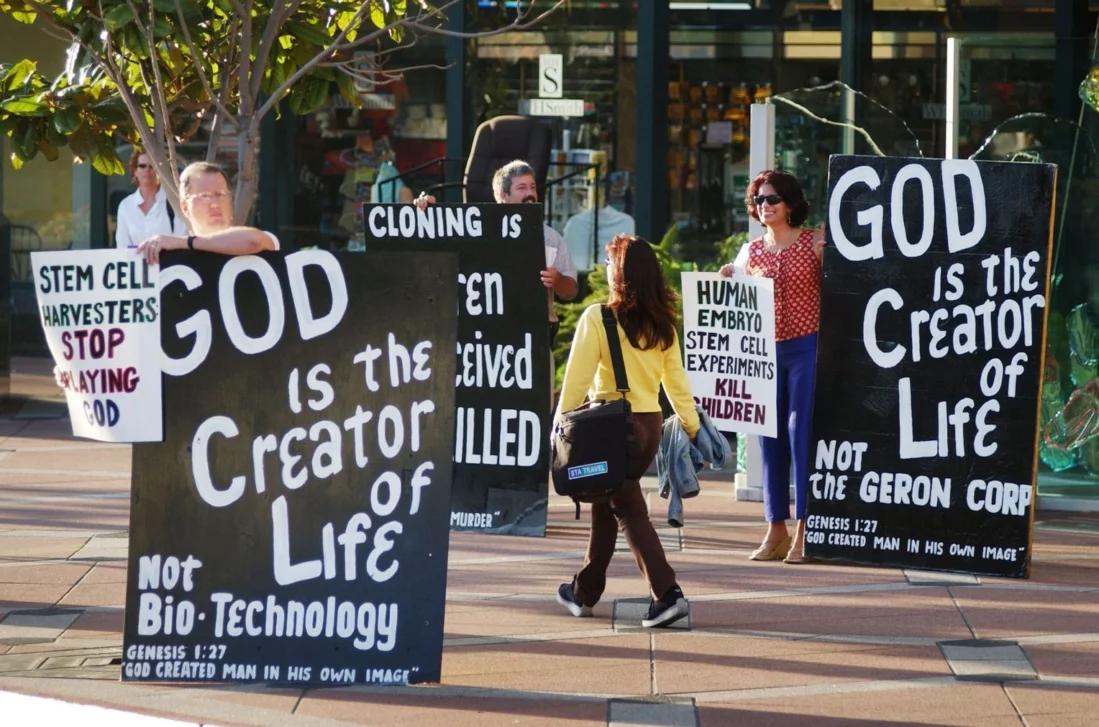 Протесты в 2002 году около офиса калифорнийской компании Geron Corportaion, которая работает над лекарствами для лечения онкологии из стволовых клеток, получаемых из человеческих эмбрионов Фото Getty