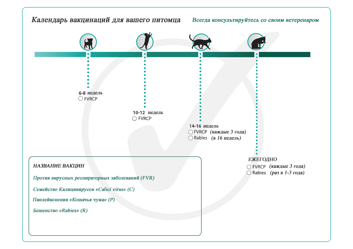 Лучше всего составить индивидуальный график прививок для вашего питомца с ветеринаром. Ветеринар должен проверить здоровье вашей кошки, перед тем как назначить ту или иную прививку. Кроме того, это отличная возможность провести полное обследование кошки и обсудить вопросы ее здоровья со специалистом.