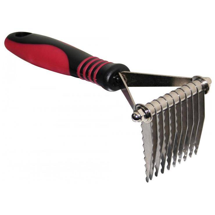Вертикальные колтунорезы бывают различной конфигурации — как с прямыми, так и с загнутыми зубьями — и существенно варьируются по длине лезвий. Инструмент с короткими зубьями предпочтительнее для короткошёрстных пород: