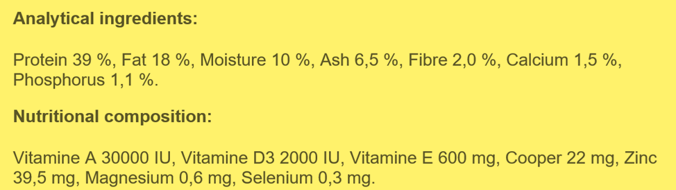 В качестве энергетической добавки применили куриный жир, стабилизированный токоферолами – вероятно, полученными из продуктов переработки растительного масла. Рыбий (лососевый) жир включили в количестве 1%, скорее всего, для обогащения кормосмеси незаменимыми кислотами омега-3.
