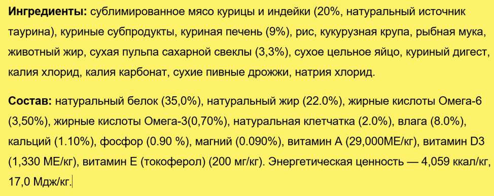 Российский производитель не полностью раскрывает состав кормосмеси. Однако из текста описания следует, что питание на 20% состоит из красного мяса индейки и курицы – натурального источника таурина. Какие куриные субпродукты использовал потребитель – неясно. Но упоминание о 9% печени позволяет предполагать, что в корме присутствуют высушенные внутренности.