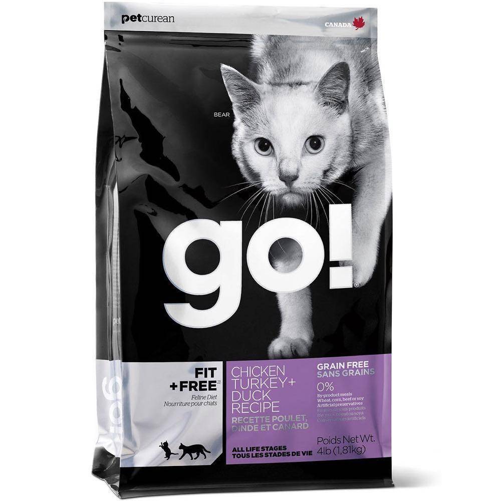 Упаковка с кормом Fit + Free имеет фиолетовую маркировку. В состав гранул входит несколько видов мяса: курица, индейка, утка и лосось. Зерновые полностью отсутствуют.