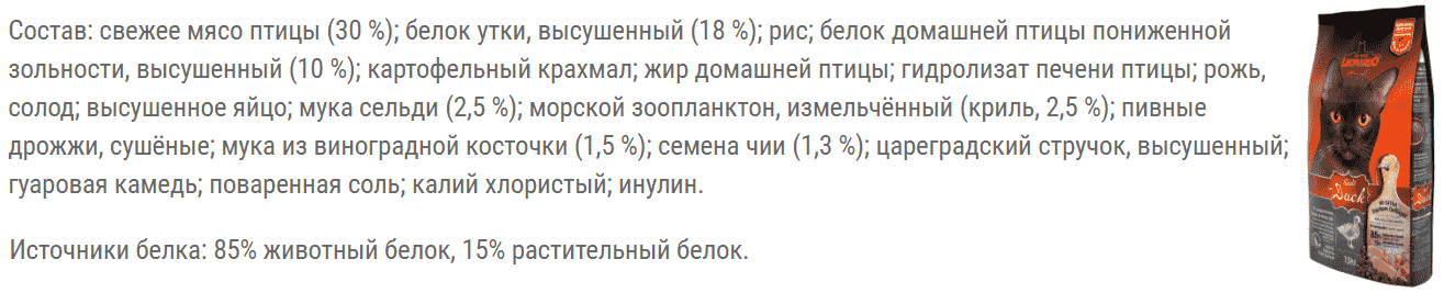 Надо отметить, что не известно из чего именно получены «белок домашней птицы» и «белок утки». Вероятно не только из мяса, но и из мясных субпродуктов. Источником углеводов в корме выступают рис, картофельный крахмал (также является загустителем) и рожь. Жир домашней птицы — источник жирных кислот.