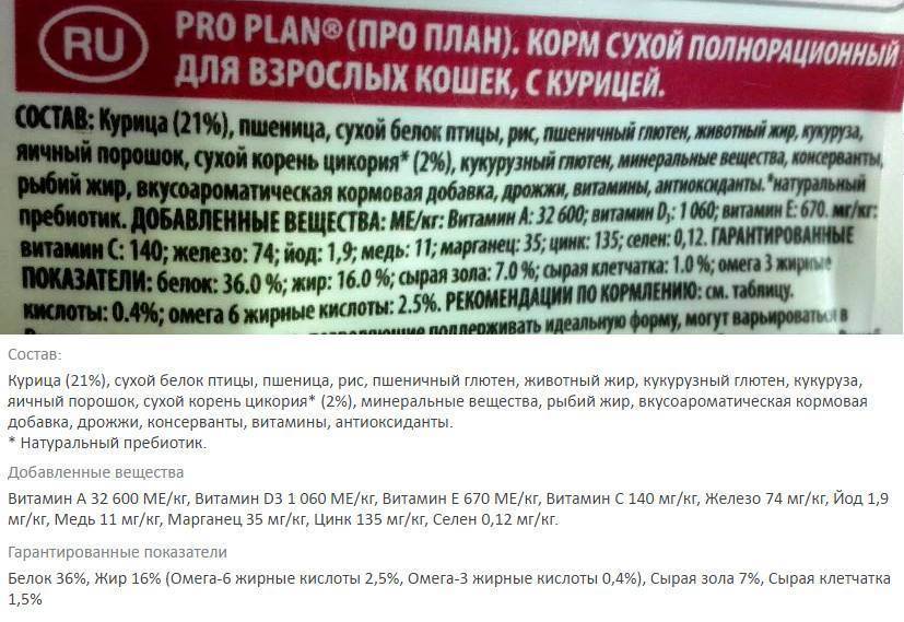Как показал анализ состава, помимо обилия злаков, в этом продукте есть еще один важный недостаток — наличие нескольких значимых компонентов, указанных общими словами. Кроме упомянутого сушеного белка домашней птицы, это животный и рыбий жир. Характеристика этих источников жира в рационе Purina One для домашних кошек не самая лучшая. Что послужило для них сырьём — точно сказать невозможно.