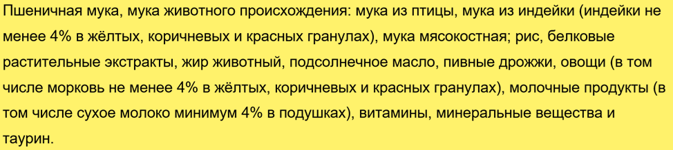 - Мука животного происхождения — мука из птицы, мука из индейки, мука мясокостная. При этом указано, что мяса индейки 4%. Количество остальных составляющих не уточняется, как не указано какие части птицы используются.