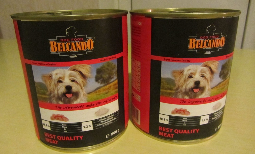 Среди влажных кормов «Белькандо» для собак есть консервы и паучи. Консервы для продажи фасуют по 400 г и 800 г в банку. Основные характеристики данной продукции:
