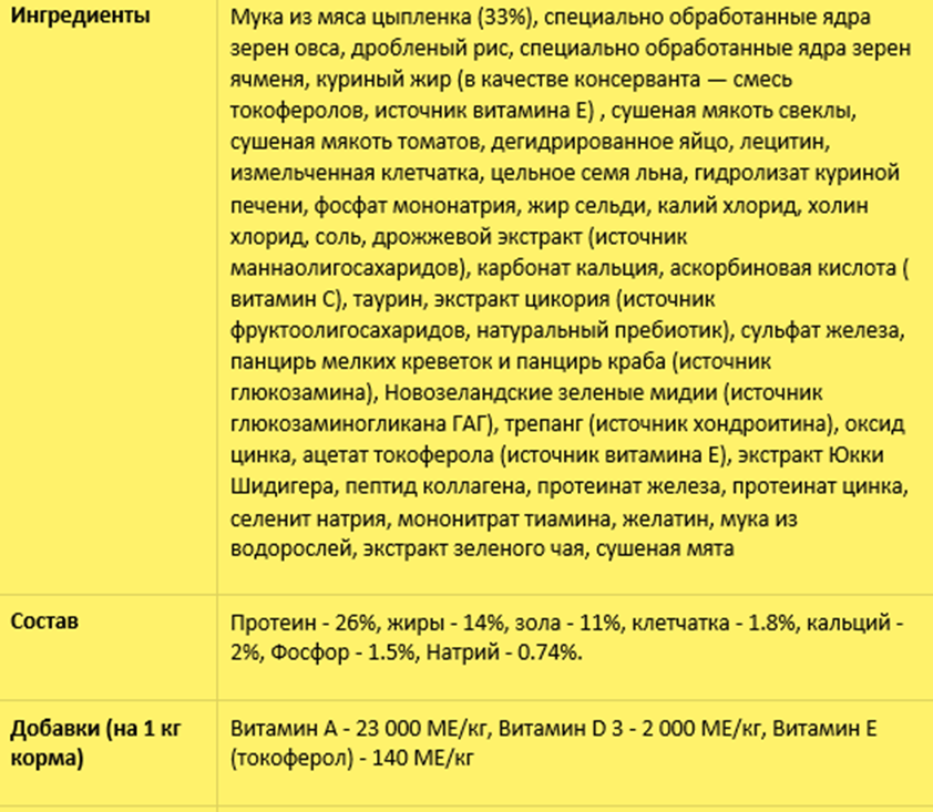 - Наличие в составе яиц, коричневого риса, рыбьего жира, минеральных и витаминных добавок в полном составе.