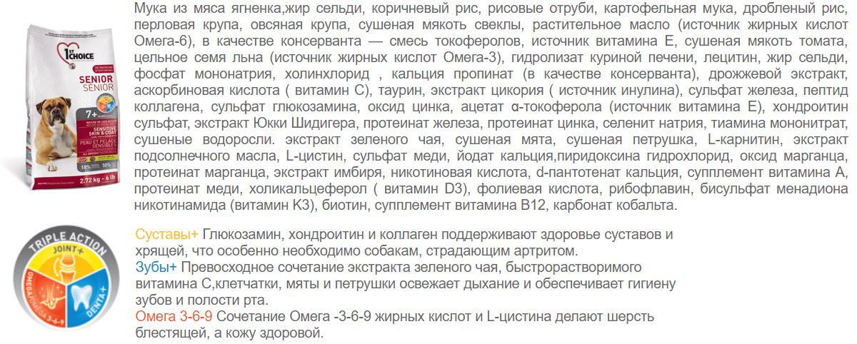 Важно! Коллаген, глюкозамин и хондроитин, находящиеся в достаточном количестве в кормах «1st Choice», поддерживают работоспособность хрящевых волокон в суставах. Это особенно важно для собак преклонного возраста, ведь у них, как и у людей, нередко возникает артрит.
