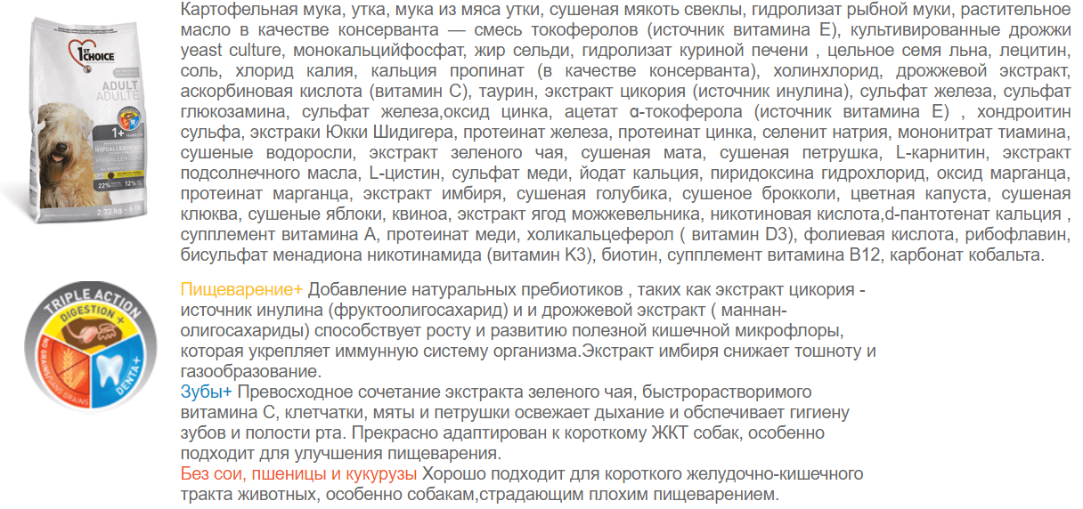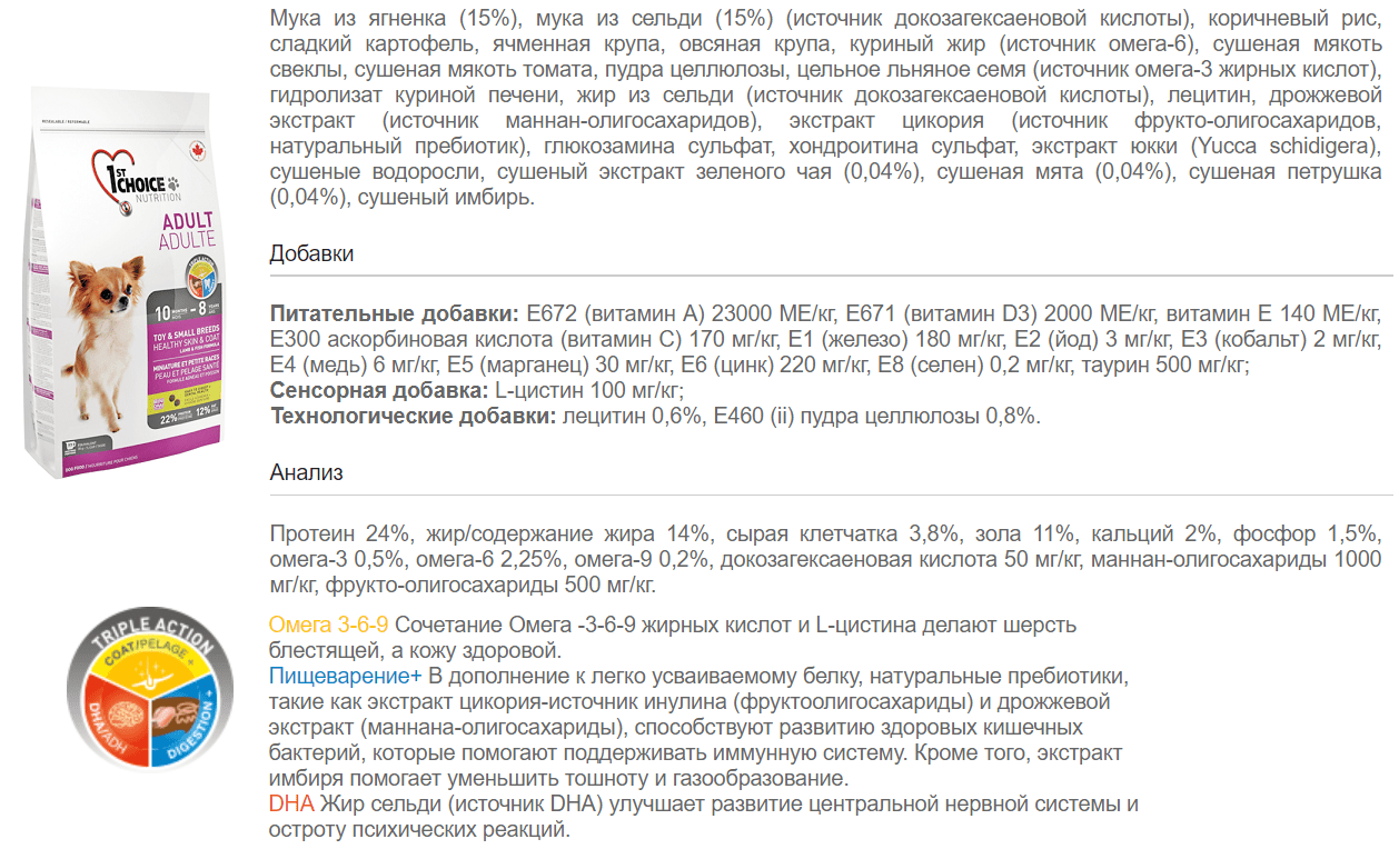 Большой плюс корма 1st choice — отсутствие в рационе дешевых наполнителей: пшеницы и кукурузы.