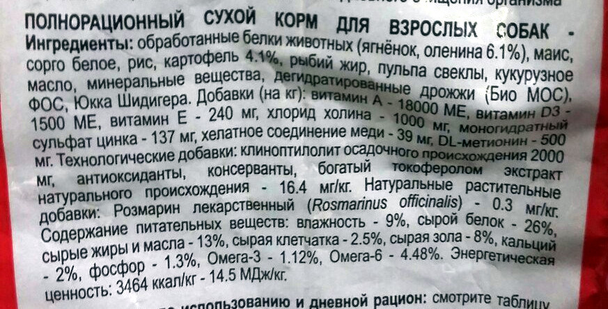 На первом месте ингредиент «обработанные белки животных», источник животных белков. Уточнено, что этот ингредиент включает белки ягненка и оленины (6%), но их общий процент не указан. Учитывая то, что далее по составу нет богатых белком ингредиентов, можно сделать выводы что основная часть из указанных в анализе 26% протеина — животного происхождения (лучше усваиваются чем растительные белки).