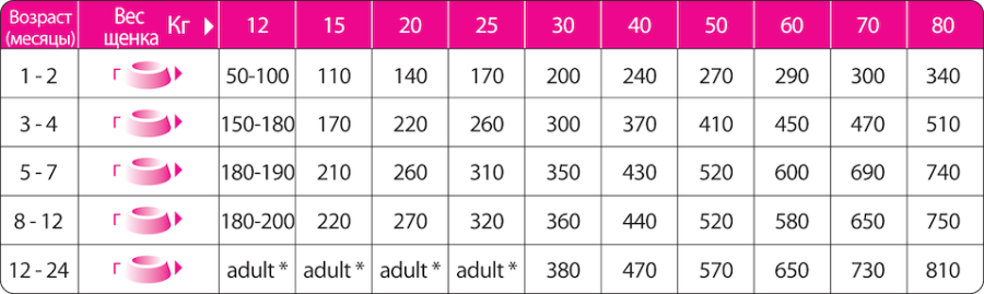 Составы кормов для щенков и взрослых собак схожи, поэтому переход на питание по возрасту, можно проводить без подготовки.