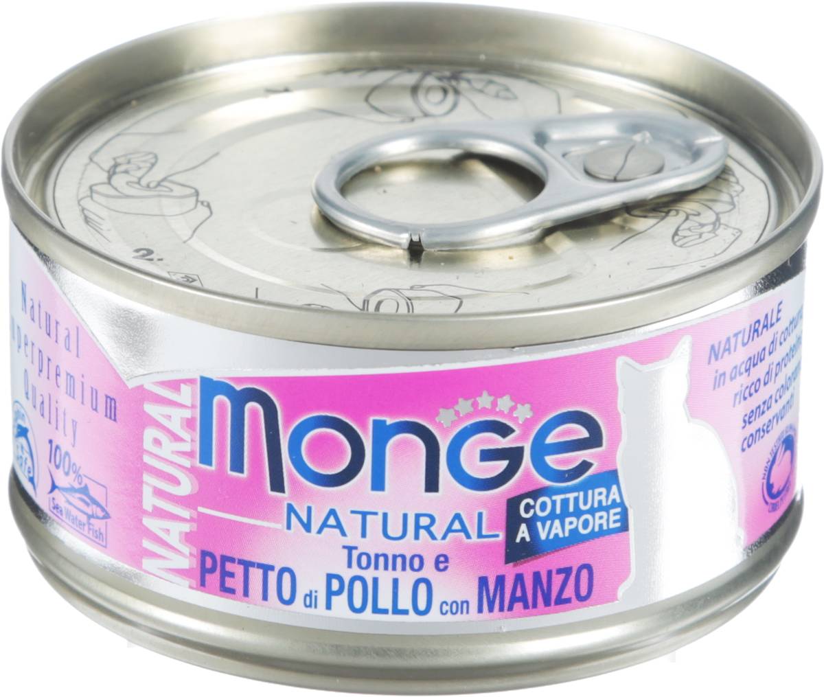 Monge Natural — это консервы с мясом птицы и рыбным филе (морепродукты, лосось, тунец).