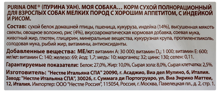 Ознакомившись с перечнем компонентов различных наименований кормов Purina One, можно получить представление о его составе: