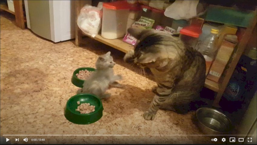 Посмотрите смешное видео о том, как мелкая кошка Пуля пытается отогнать взрослого кота Фюрера от его миски, хотя её миска полна