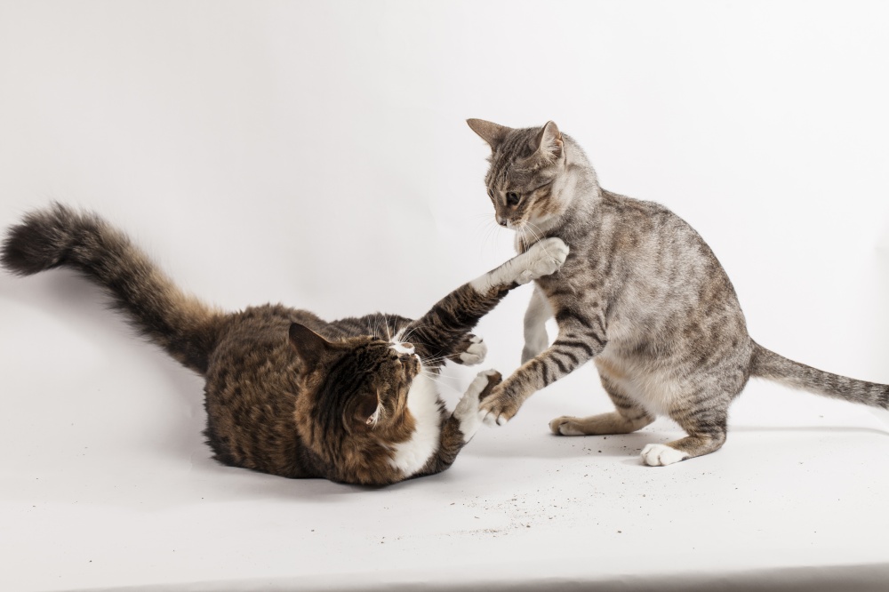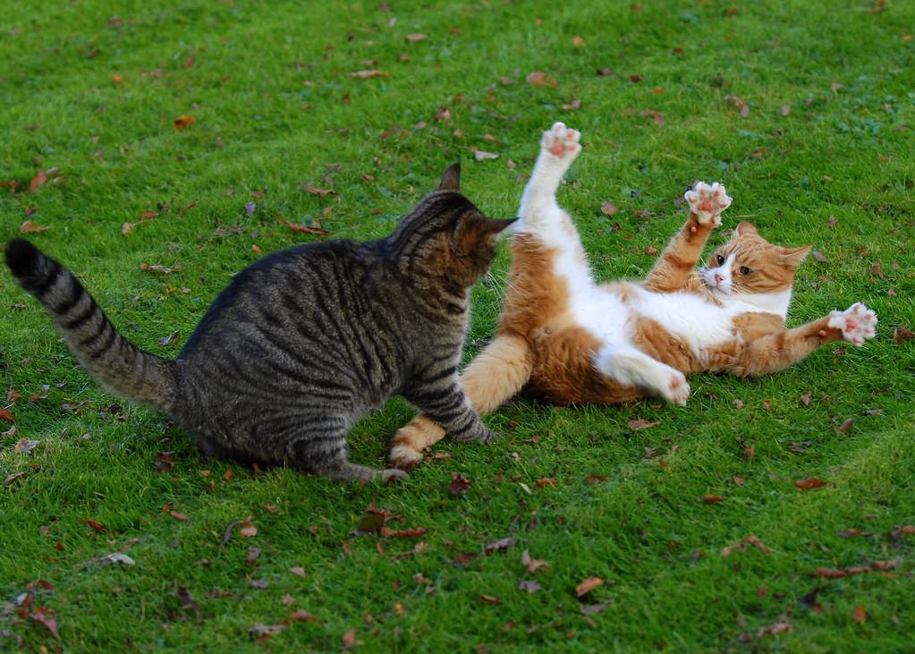 Многие кошки получают удовольствие от игровых боев и будут преследовать друг друга и бить друг друга лапами. Основное различие между игровым боем и настоящим — это шум. Игровые бои, как правило, тихие, с множеством пауз. Любые укусы мягкие и не вызывают травм или боли, а когти, как правило, втягиваются. В некоторых случаях игровые бои могут обостряться, и если ваши кошки начинают шипеть или рычать, это может указывать на то, что один из них становится слишком грубым. Когда кошки просто играют, потом обе возвращаются в нормальное состояние, без явного напряжения между ними.