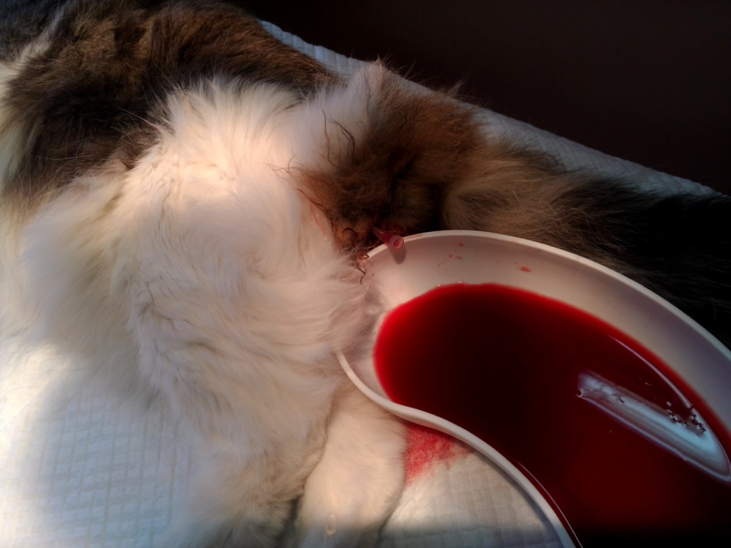 Нередко назначают клубничный сок по одной чайной ложке, отварную тыкву, горячую ванну на десять минут (кота осторожно опускают в воду до области сердца)