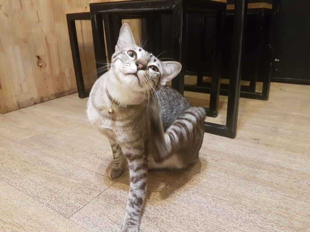 Кошка грызет себя и чешется, когда у нее зудит кожа.