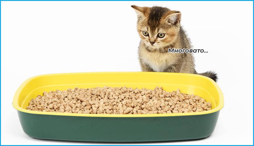 Количество наполнителя указывается в виде толщины слоя в сантиметрах. У каждого наполнителя существует оптимальный объем, который позволяет кошке удовлетворять ее инстинкт закапывать экскременты и при этом не рассыпать содержимое. Слишком тонкий слой — питомцу приходится «копать» дно лотка. Слишком большое количество гранул или хлопьев — они высыпаются наружу, что позволяет запаху туалета распространяться и «приманивать» кошку ходить не в лоток, а вне него. Поэтому менять кошачий туалет желательно с тем же количеством наполнителя, к которому привыкла кошка.
