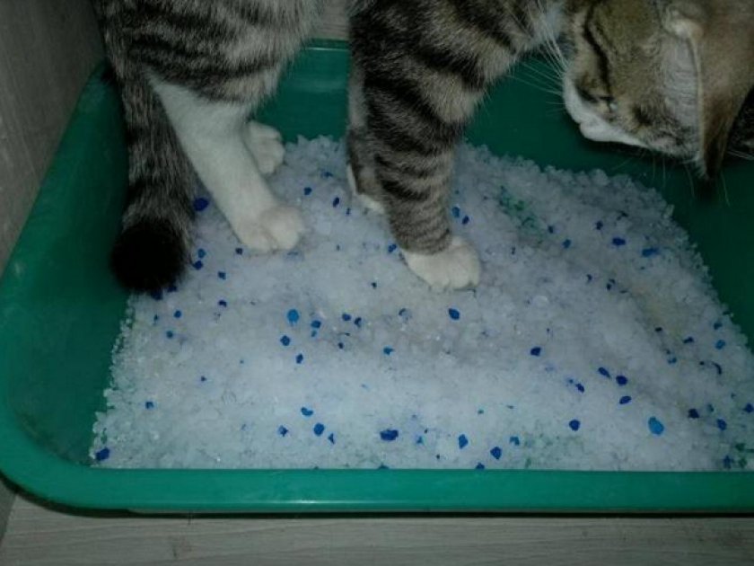Наполнитель на основе силикагеля отлично впитывает влагу и остаётся при этом совершенно сухим на ощупь. Подойдёт для взрослой кошки, которая не станет пробовать его на вкус. Для маленького котёнка такой наполнитель не подходит, так как это может привести к отравлению, если он проглотит гранулу.