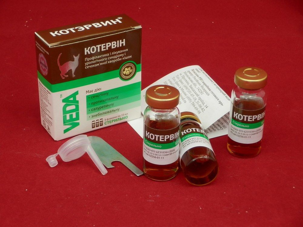 Когда урологическое заболевание у котов сопровождается кровоточивостью и увеличением рН-уровня, лечебный урологический препарат дают перорально 3 раза в день по 2 мл. Кроме Котэрвинаобязательно животному будут назначены и дополнительные лечебные составы.