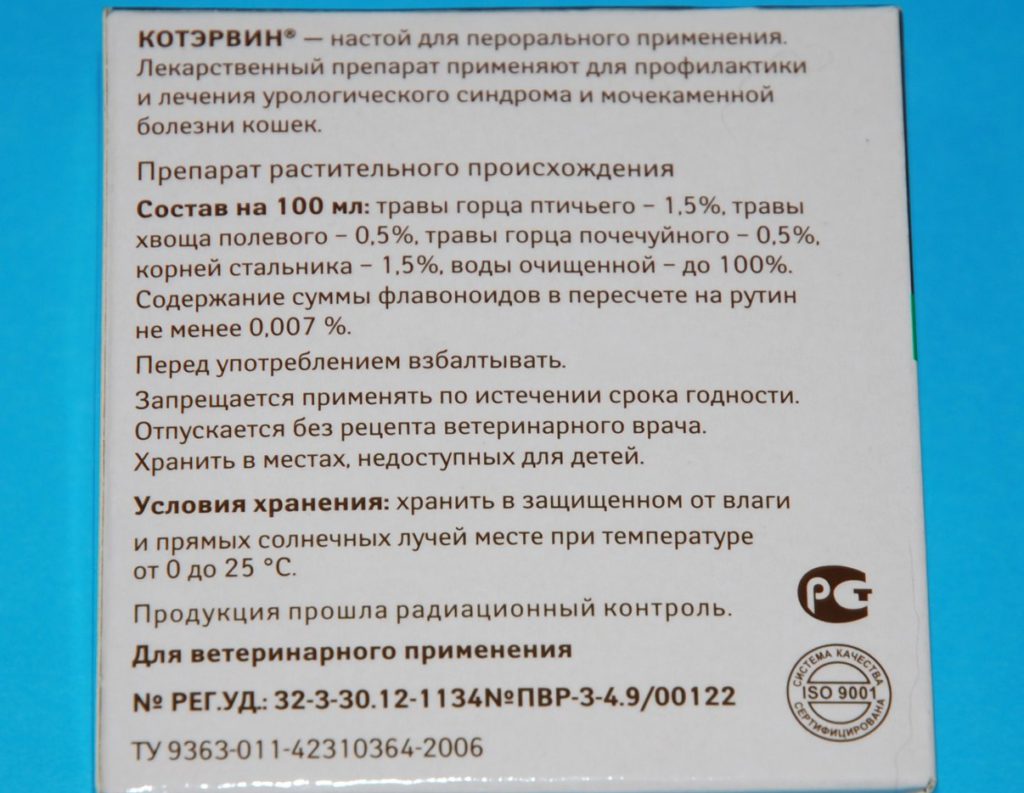 КОТЭРВИН — лекарственный препарат растительного происхождения, предназначенный для профилактики и лечения болезней мочевыводящих путей у кошек :