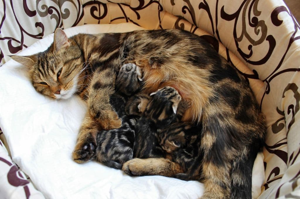 Послеродовой период у кошки начинается с момента появления последнего котенка на свет. Это довольно трудное время для животного. Много ресурсов тратится на уход за котятами, их кормление, а также восстановление собственного здоровья. В первые дни после родов кошка обычно много спит, набираясь сил, и мало ест, так как питается последом.