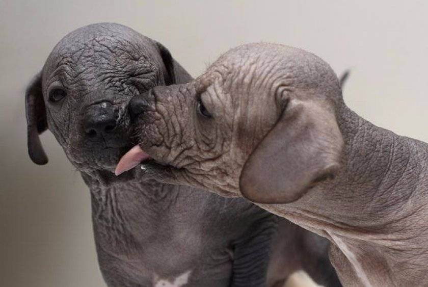 Внешний вид маленьких щенят ксолоитцкуинтли немного отталкивает. Тело малышей сбитое, конечности короткие, кожа покрыта складками. Такие данные не должны смущать покупателя, так как телосложение поменяется с возрастом, а морщины разгладятся.